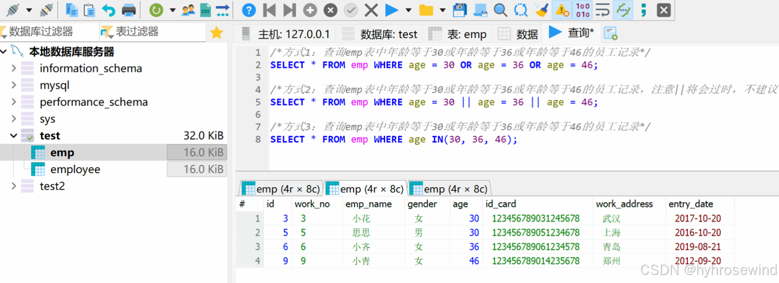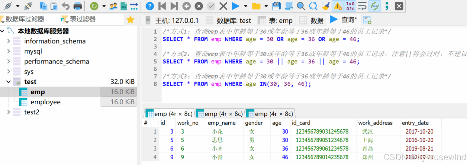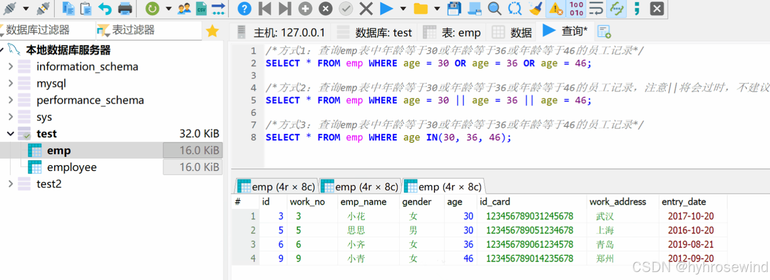查询emp表中年龄在29,32,30,46的女性员工记录
