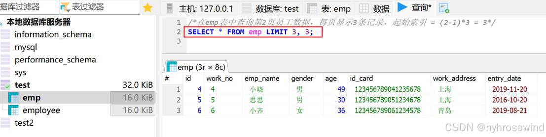 在emp表中查询第2页员工数据,每页显示3条记录