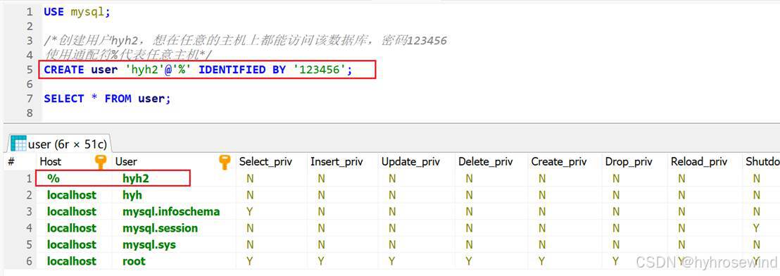 /*创建用户hyh2,想在任意的主机上都能访问该数据库,密码123456