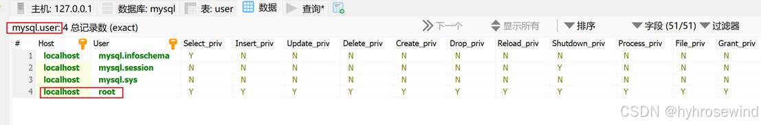 查看mysql系统数据库的user表中的数据
