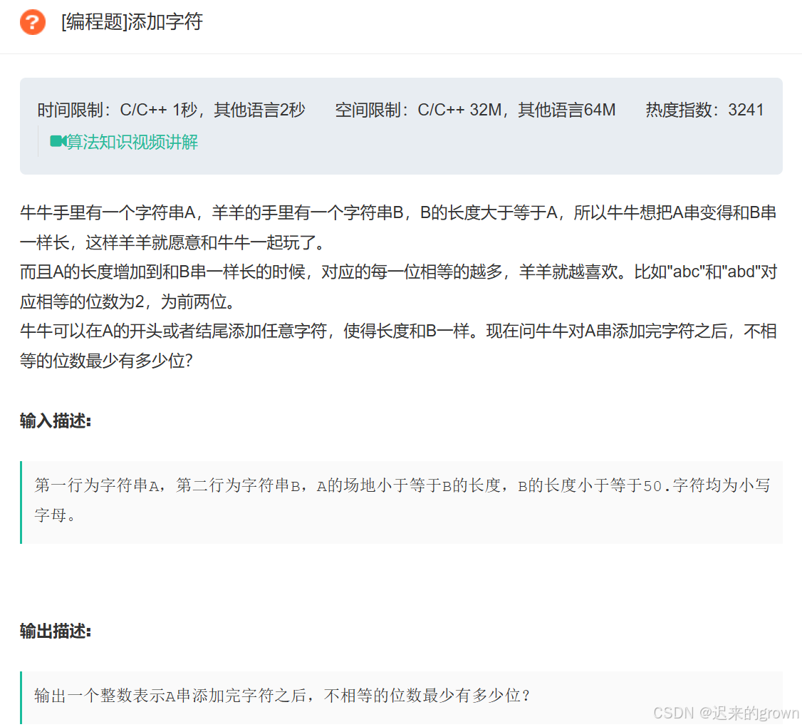 A字符串添加字符,使得A字符串长度等于B字符串的长度,并且要求对应位置的字母尽量相等,然后求出来不相等的字符最少有多少位。