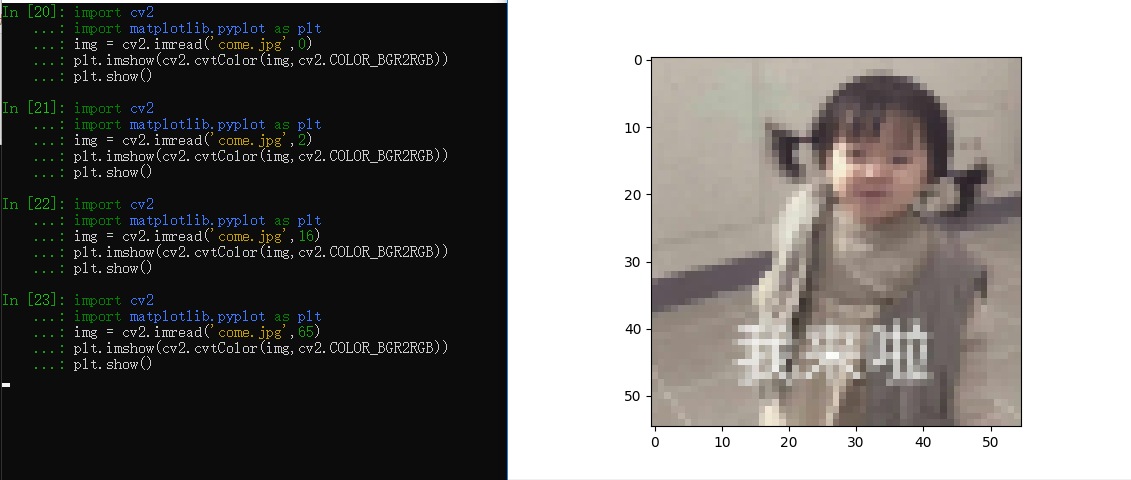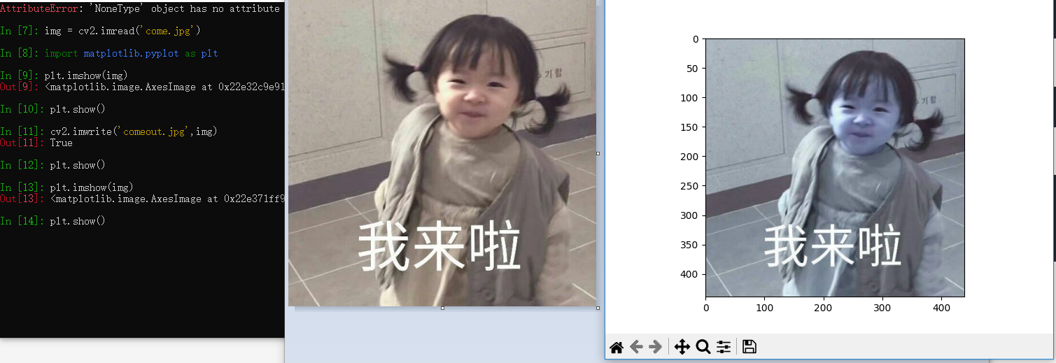 这里第一张图是用画图工具打开显示的,第二张图是 python matplotlib 显示的图片,二者的不同是因为,cv2.imread() 返回的是BGR 色彩空间,而我们一般所用的RGB色彩空间,可以通过色彩空间的转化实现第一张图。