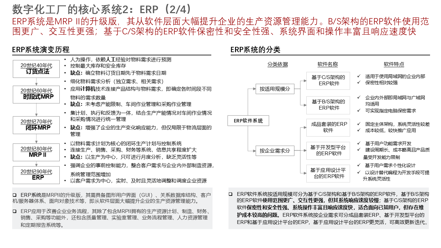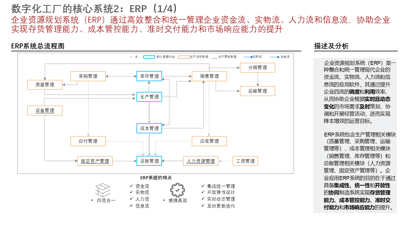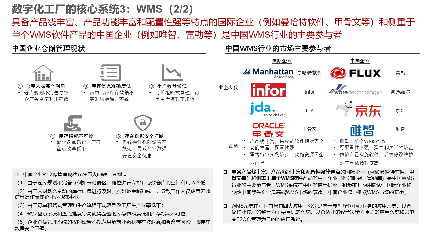 接着详细介绍五大核心系统:PLM 覆盖产品全生命周期,助力企业协同研发、优化决策;ERP 整合企业资源,提升管理能力;WMS 高效管理物料资源,改善仓储现状;DCS 广泛应用于多行业,实现分级控制;MOM 作为 MES 升级版,优化企业运营,提升生产效率和质量。同时分析了各系统市场参与者和竞争格局。