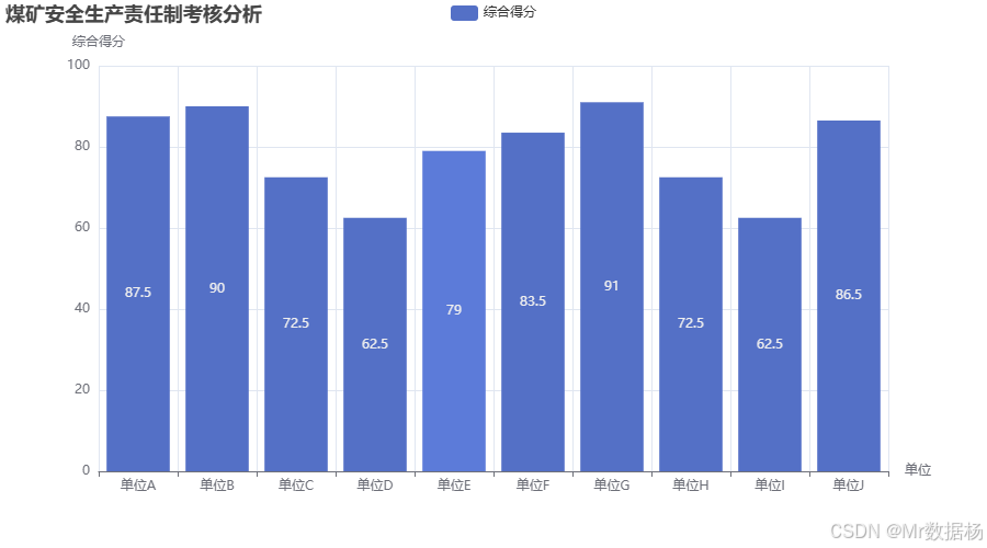 在这段代码中,使用了pandas库来处理模拟的考核数据,构建了一个包含10个单位考核得分的数据框(DataFrame)。然后,使用pyecharts库来生成一个柱状图,显示每个单位的综合得分。这些得分反映了单位在季度安全生产考核中的表现,通过柱状图可以直观地对各单位的安全生产责任落实情况进行比较。图表的x轴代表不同单位,y轴代表综合得分,图表的标题则清晰显示了图表的分析内容。数据可视化部分为数据分析提供了便捷的展示手段,使得结果更加直观和易于理解。