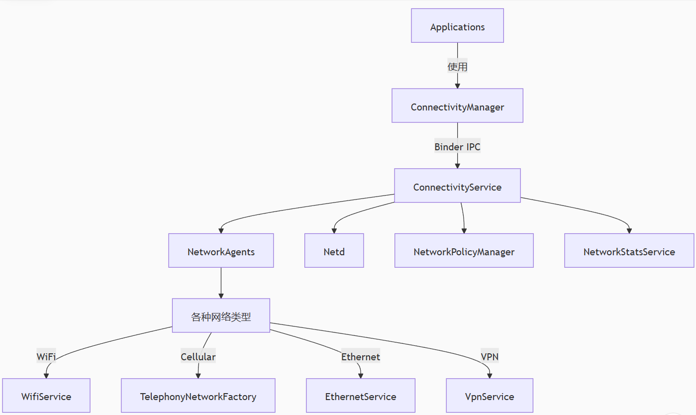 使用还是比较简单,在app层主要就是ConnectivityManager,不过这里只能获取一些网络信息。