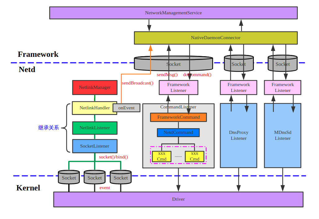 在安卓的网络结构中,netd处在更核心的位置。netd的位置大致如下: