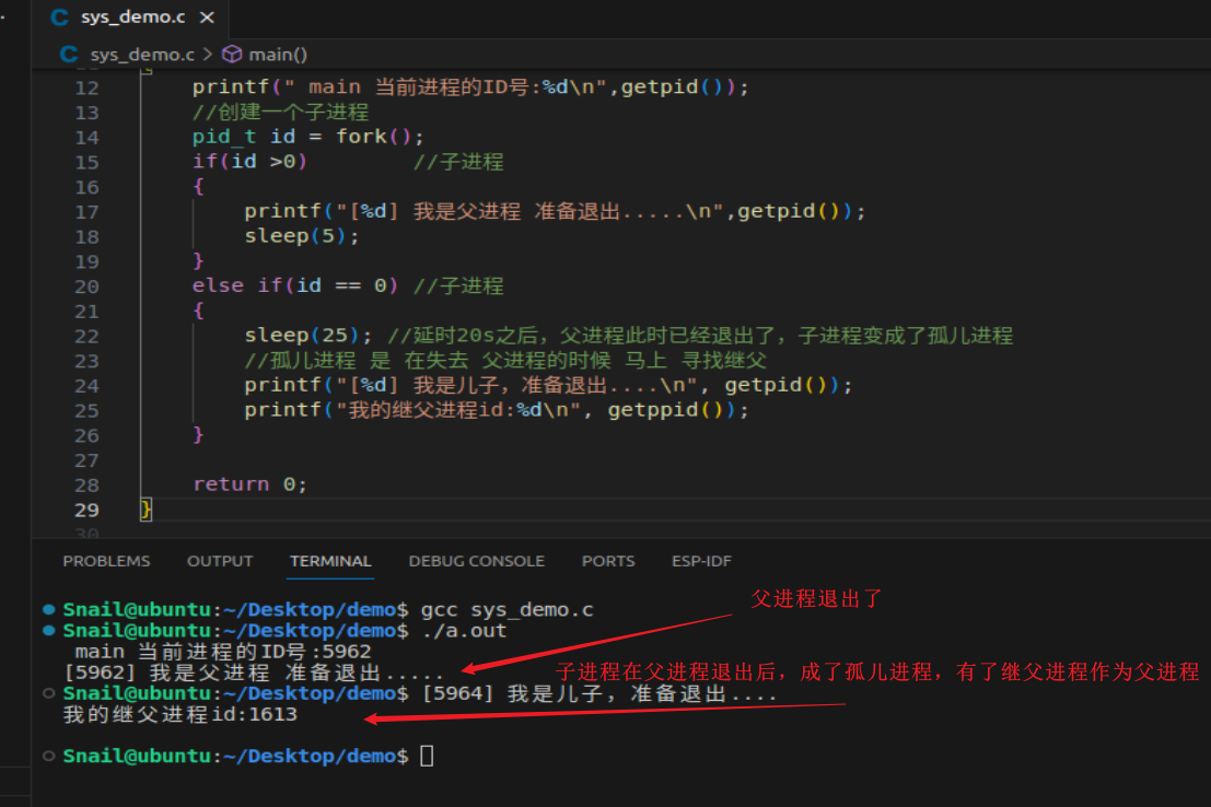 Snail@ubuntu:~/Desktop/demo$ ps -ef UID PID PPID C STIME TTY TIME CMD root 1 0 0 16:03 ? 00:00:04 /sbin/init auto nopromp ... Snail 10651 5605 0 17:27 pts/0 00:00:00 /usr/bin/bash --init-fi ... Snail 10814 10651 0 17:27 pts/0 00:00:00 ./a.out Snail 10815 10814 0 17:27 pts/0 00:00:00 [a.out] <defunct>