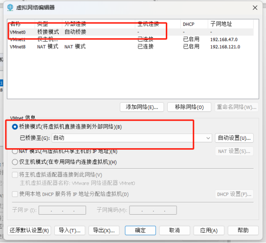 然后点击编辑,选择虚拟机网络编辑器,如果名称中没有VMnet0,就点击右下角更改设置,自己设置。