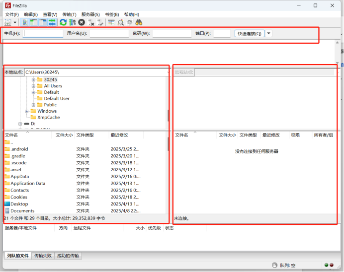 工具栏下方是连接虚拟机的一些相关信息,左侧文件为本地(用户段)的相关文件,右侧为所连接虚拟机的相关文件。
