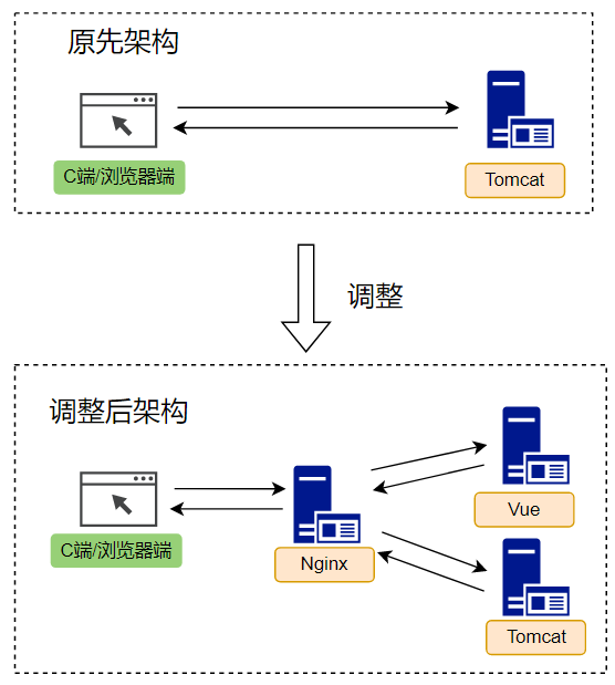 我有个后端框架,做API接口用,平时都是用Tomcat做HTTPS解析,但是近期因为VUE要对接,静态和动态服务想区分不同服务器,于是用上Nginx做区分,自然是很好很好用的了。架构如下图,这样的调整也实在太常见,没什么可看的了。