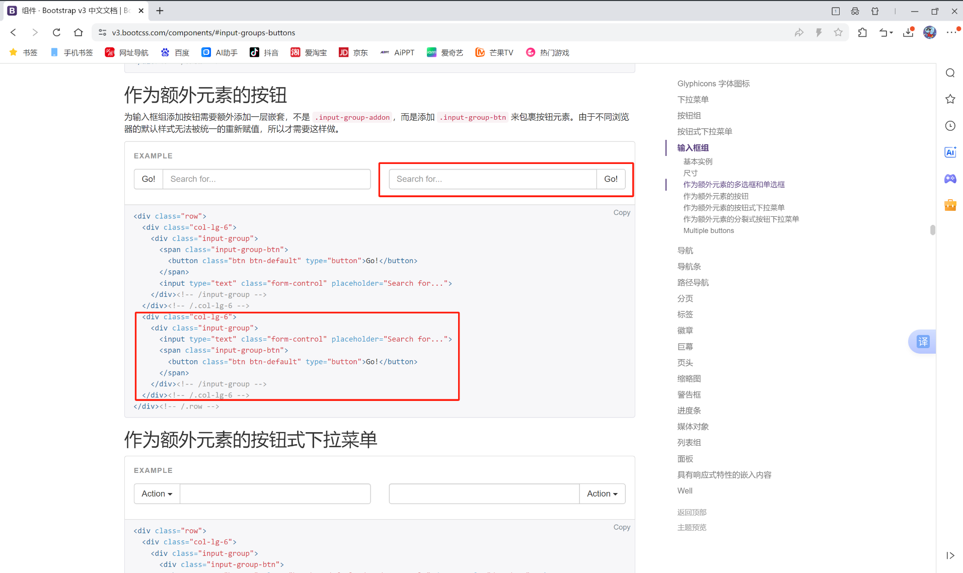 我们到bootstrap官网, 点击组件, 然后找到输入框组, 并点击作为额外元素的按钮。