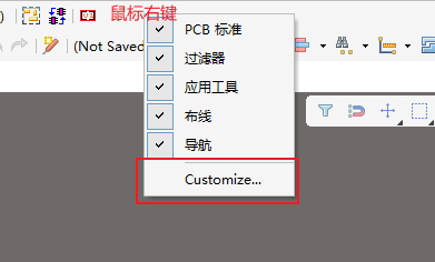 在Altium Designer界面,右键点击菜单栏或工具栏区域,选择 “Customize”(自定义)