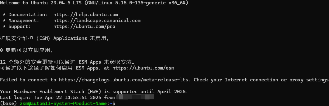 确认下ip地址和用户名信息,确认无误后输入yes,输入对应用户的密码后,一般出现类似以下提示信息,说明SSH连接成功了,接下来就可以利用服务器的算力搞科研了:
