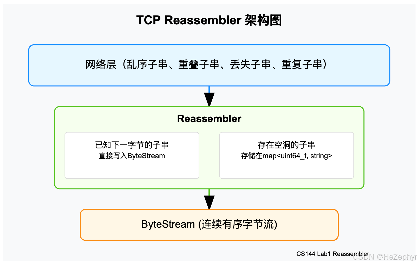 在网络传输的过程中,TCP协议必须解决一个关键挑战:如何将不可靠的网络上传输的、可能乱序、丢失、重复或重叠的数据包片段重新组装成连续的字节流?这正是Stanford CS144 Lab1中我们要实现的Reassembler(重组器)组件的核心功能。