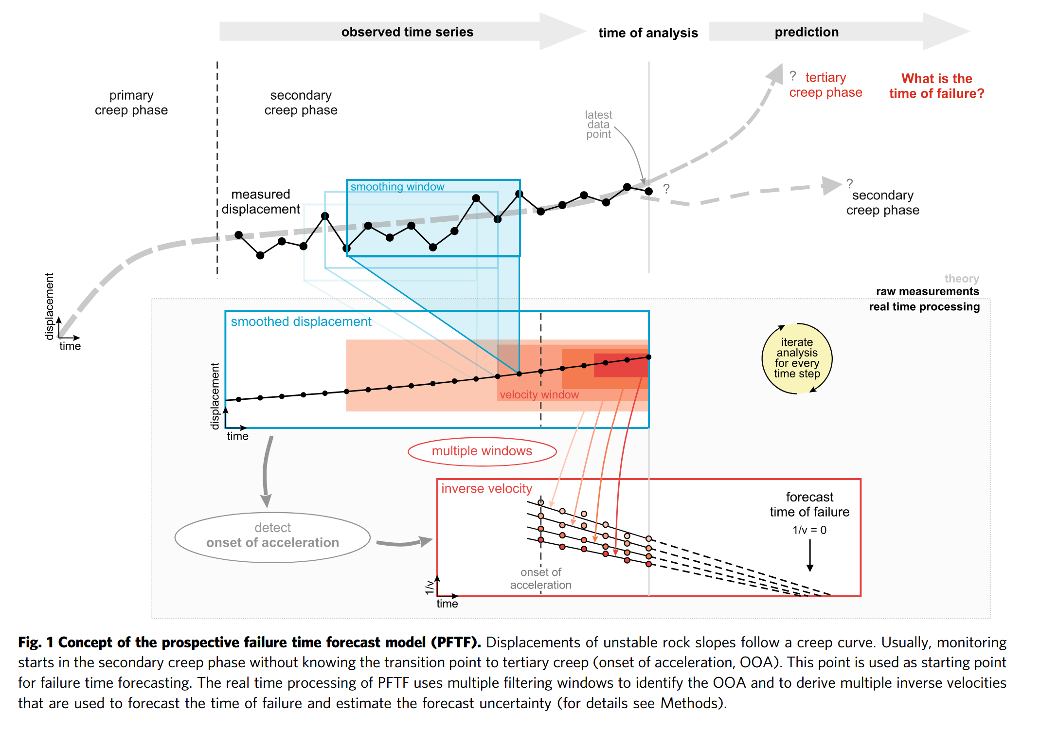 在该方法中,将边坡体反速度随时间绘制于图中,在三级蠕变期间进行线性拟合,外推曲线与横轴的交点(即速度无限大时刻)即为预测的失稳时间(图1下图)。尽管在事后分析中常能找到良好的反速度线性拟合以匹配实际失稳时间[7–9,26–30],但在实时场景中实现可靠的前瞻性预测仍是一大挑战[^31,32]。