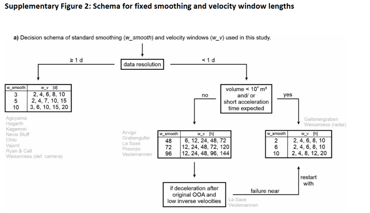 此外,平滑窗口并非固定不变。在条件发生变化时(例如 OOA 后出现减速,但仍假设失稳即将发生),需对平滑窗口进行调整(详见补充图2及 La Saxe 与 Veslemannen 地点的情况)。