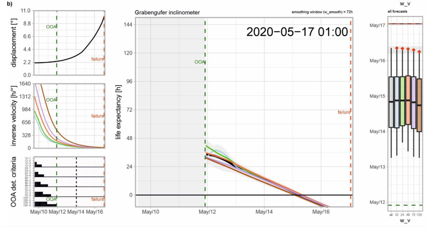 OOA 能够在失稳前0.1–200天之间成功识别,其判定时间与失稳体积和变形机制相关(参见“收敛预测”)。与平滑窗口类似,当趋势发生变化时(如出现新的加速或减速),应重新启动 OOA 分析。尽管应尽量减少误报的发生,但由于周期性加速与自然变异的存在,误报仍不可完全避免。