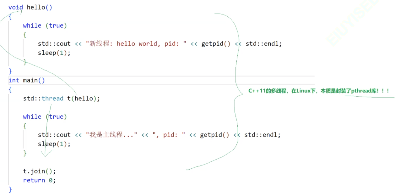std::cout << "新线程: hello world, pid: " << getpid() << std::endl;