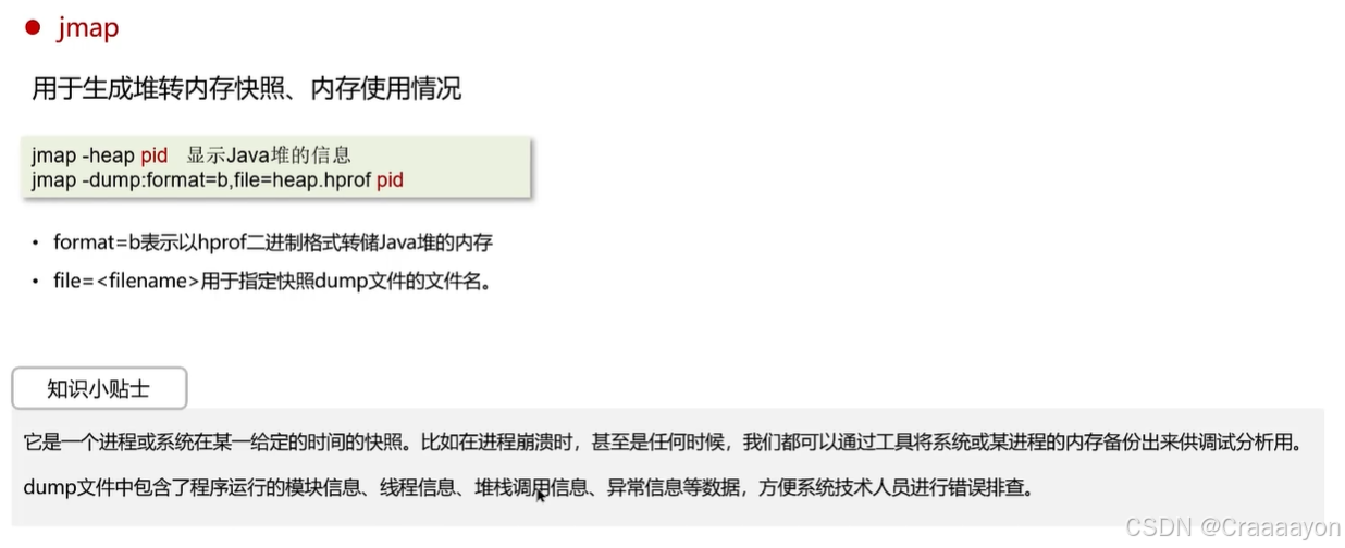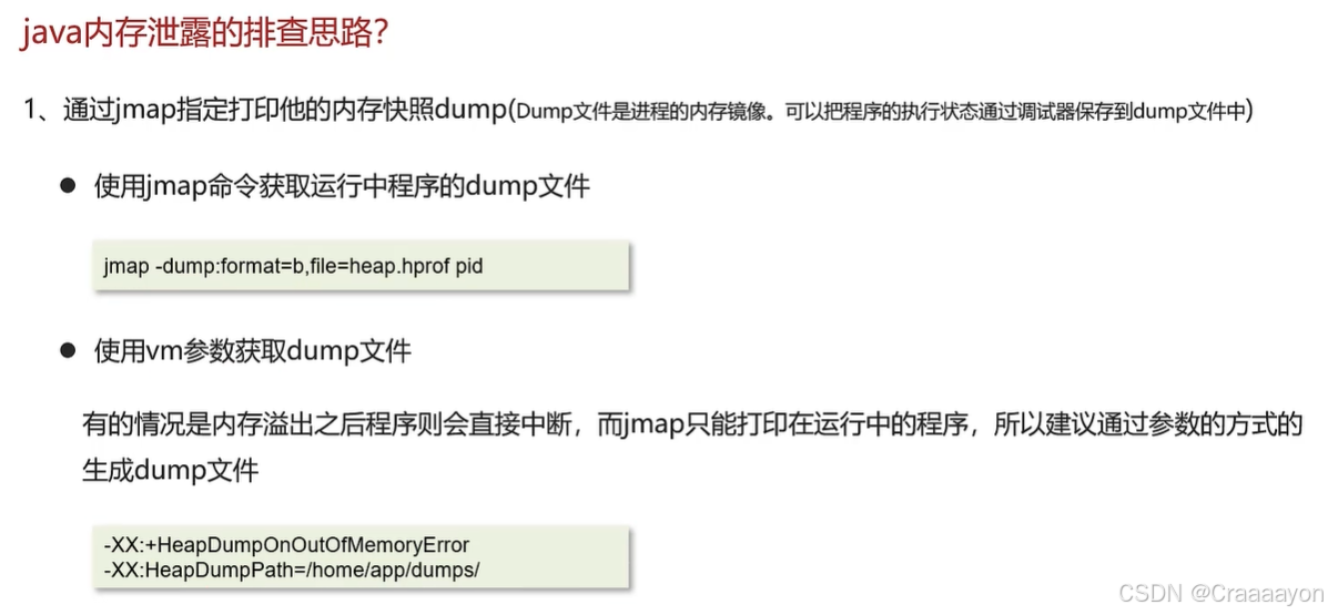 - 因为要想使用jmap命令就必须将项目启动起来,并根据其线程id来查询,但是当服务宕机时是无法获取到线程id的,此时也就不能使用jmap命令。
