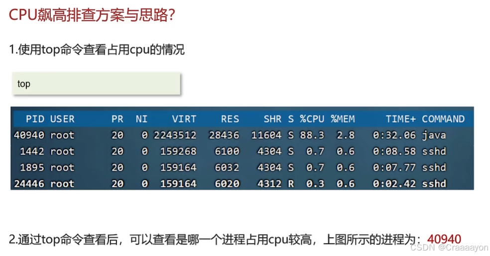 在linux系统上打印该命令就能查看当前占用CPU的排行,可以看到占用最高的进程是一个java程序,进程id为2266。