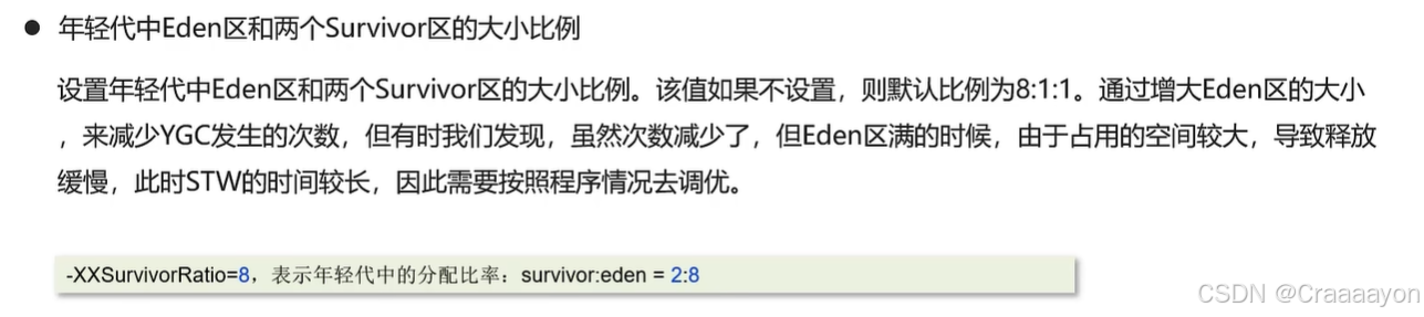 “-XXSurvivorRatio=8"代表Eden区占了总年轻代中的八份空间;“survivor:eden"代表两个Survivor区共用两份空间,Eden区占了八份空间。