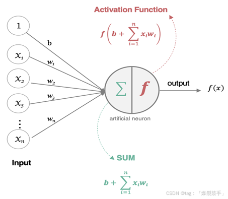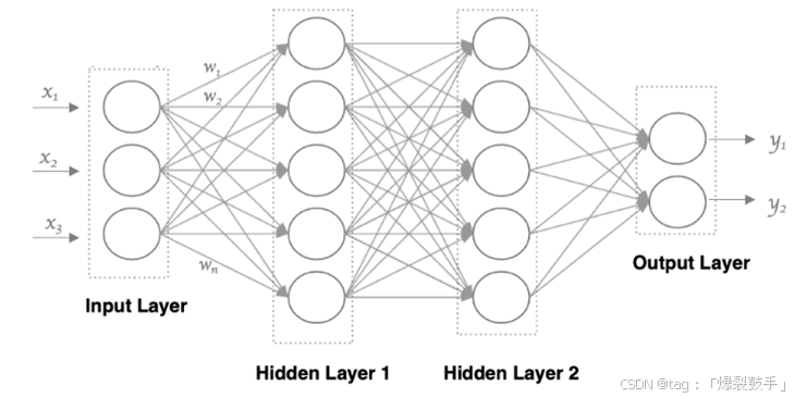 神经网络中信息只向一个方向移动,即从输入节点向前移动,通过隐藏节点,再向输出节点移动。其中的基本部分是: