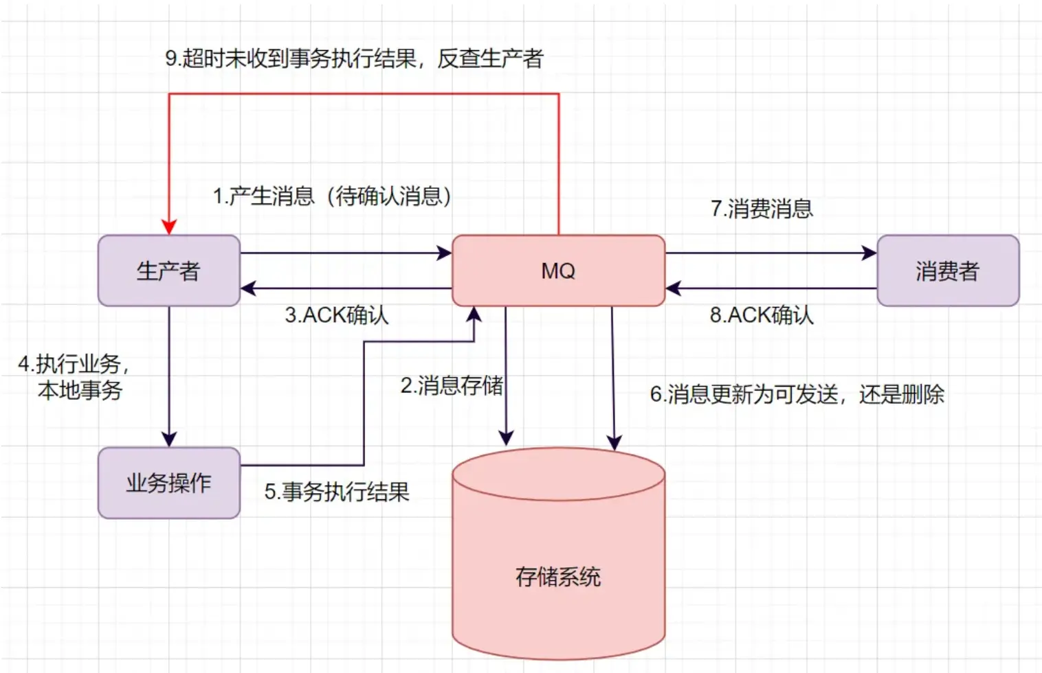 - MQ收到消息后,将消息持久化到存储系统,这条消息的状态是待发送状态。