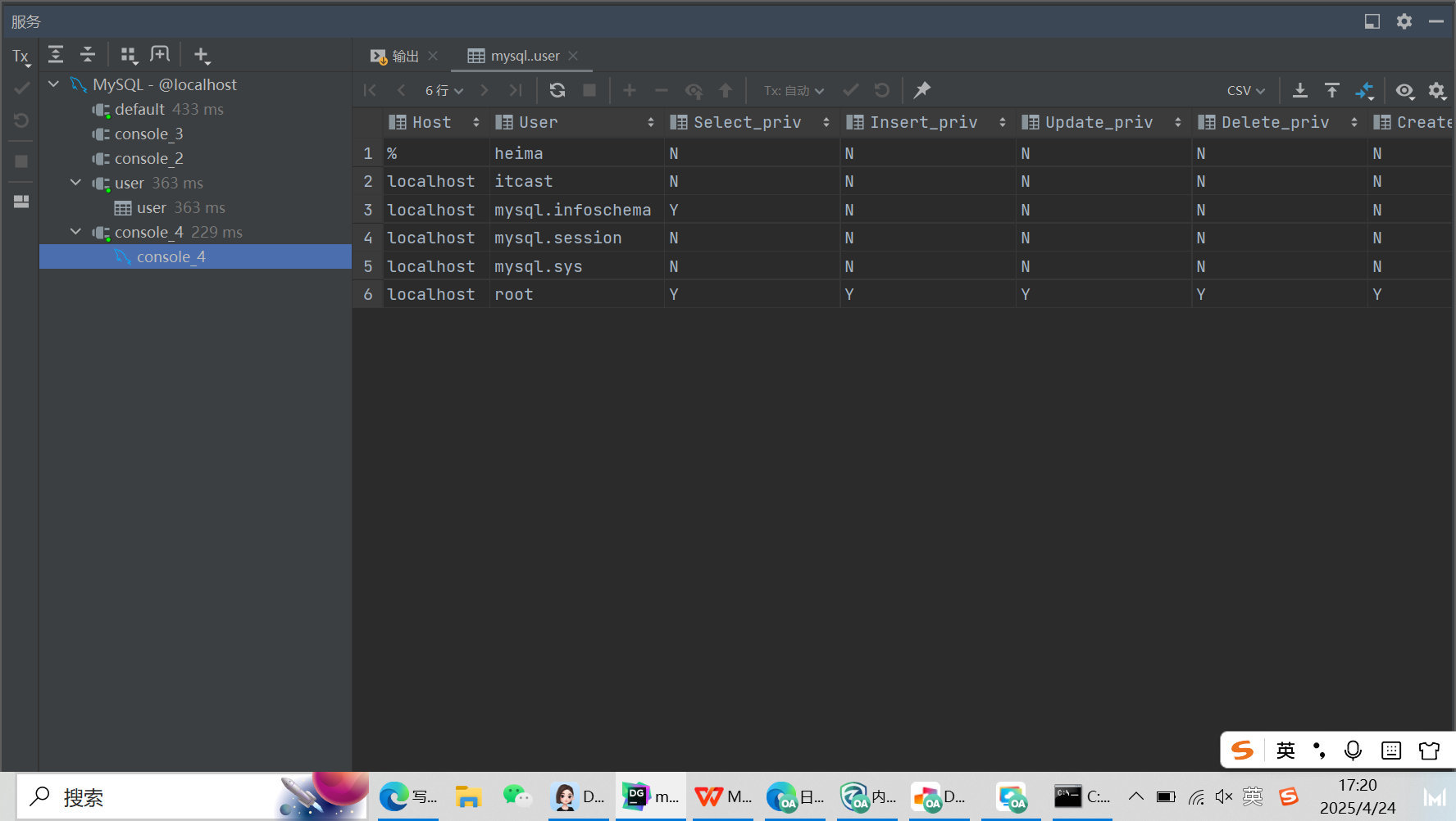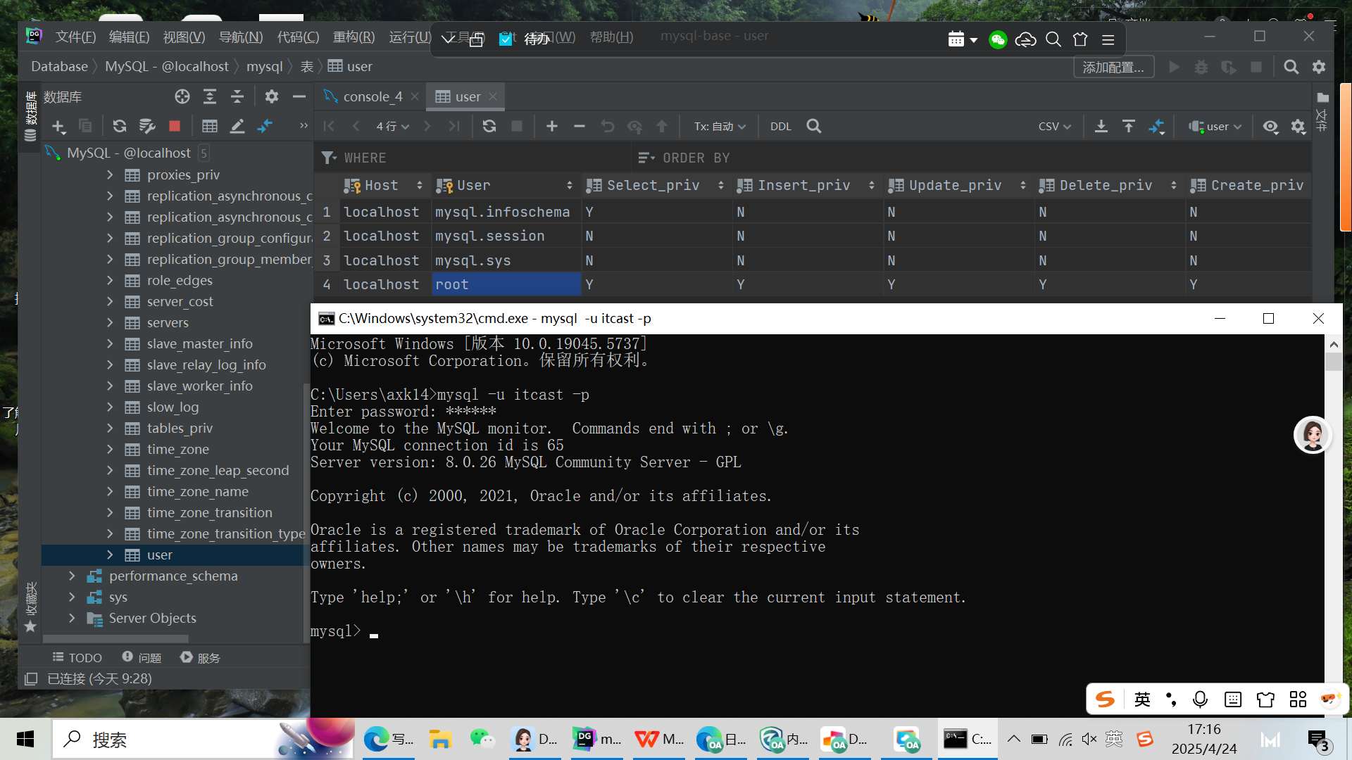 这个时候在cmd也可以看到heima这个用户所有的数据库多了一个itcast权限数据库。