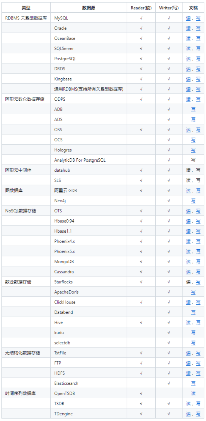当需要接入一个新的数据源的时候,只需要将此数据源对接到DataX,便能跟已有的数据源做到无缝数据同步。DataX目前已经有了比较全面的插件体系,主流的RDBMS数据库、NOSQL、大数据计算系统都已经接入。DataX支持目前市面上几乎所有的数据库类型,如下图所示: