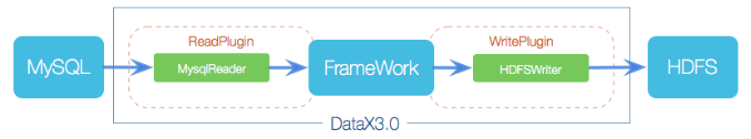 作为离线数据同步框架,采用Framework + plugin架构。将数据源读取、写入抽象成为Reader/Writer插件,纳入到整个同步框架: