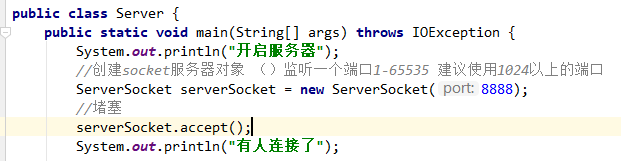 现在我们创建了服务器,那么就要等待别人来连接我们,比如微信输入了账号密码以后点击登录,此时账号和密码会发送给服务器,服务器验证了账号密码看是否存在,返回一个值。我们调用一个堵塞方法来等待别人连接服务器。