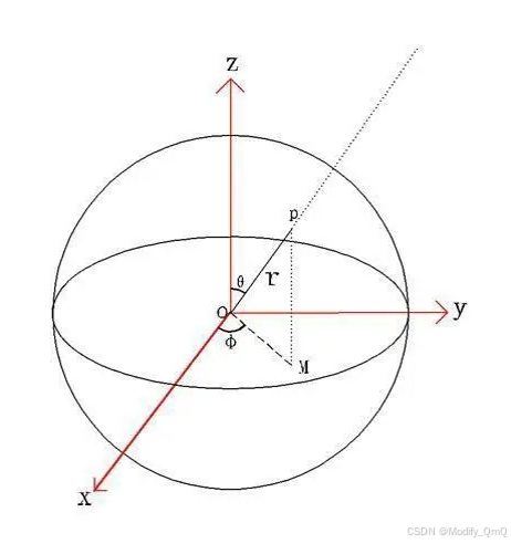 如下图所示,这是一个球,现在已知半径为r,求球上一点P的坐标,其中该点与中心点连线与z轴的夹角为θ,该点往平面做投影,投影到中心点连线和x轴的夹角为φ。