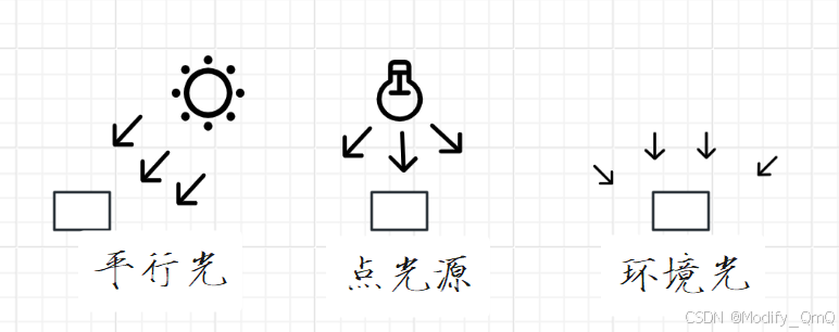 - 平行光(Directional Light):光线是相互平行的,平行光具有方向。平行光可以看作是无限远处的光源(比如太阳)发出的光。因为太阳距离地球很远,所以阳光到达地球时可以认为是平行的。平行光很简单,可以用一个方向和一个颜色来定义