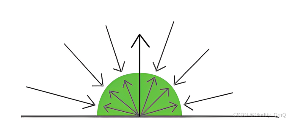 - 环境反射(Ambient Reflection):环境反射是针对环境光而言的。在环境反射中,反射光的方向可以认为就是人射光的反方向。由于环境光照射物体的方式就是各方向均匀、强度相等的,所以反射光也是各向均匀的。