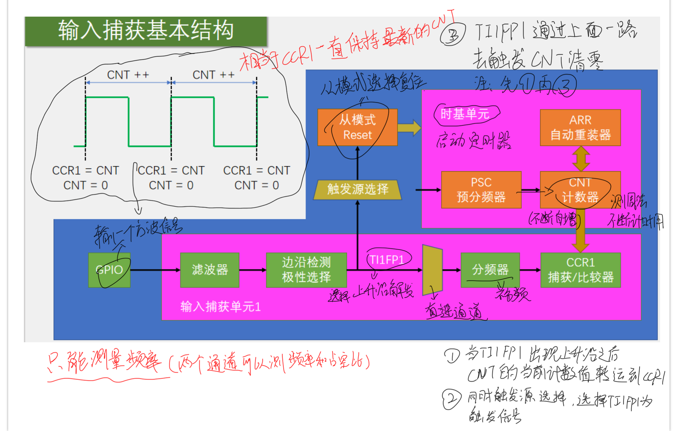 - 可配置为PWMI模式,同时测量频率和占空比