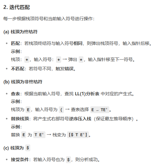 b. 如果X是非终结符,查找分析表M[X, a](a是当前输入符号),若表中有产生式X→α,将X弹出,将α逆序压入栈中;若表中无条目,报错。