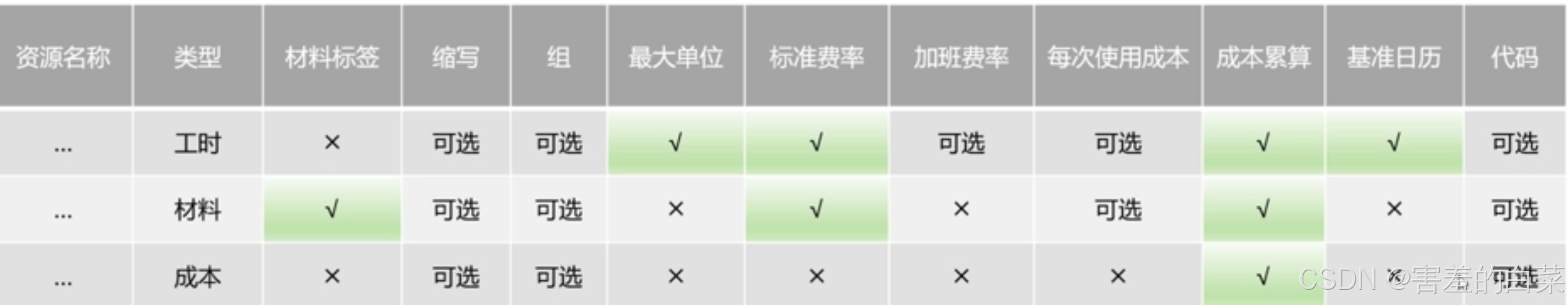 除了资源名称是必须设置的之外,剩余的资源的可设置选项如下图所示,√部分是必须要设置的,×部分是不能设置的,可选的话任意设置即可编辑设置工时类资源在不同时间段的可用性
