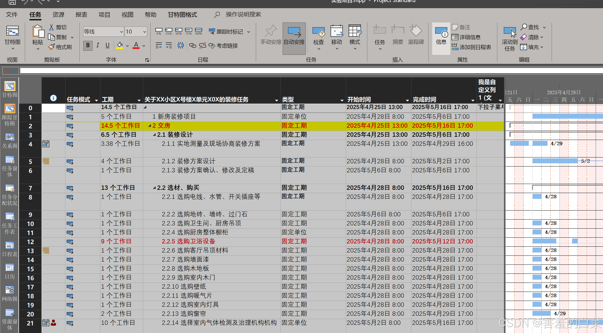 修改之前的任务类型为“自动工期” 的方法