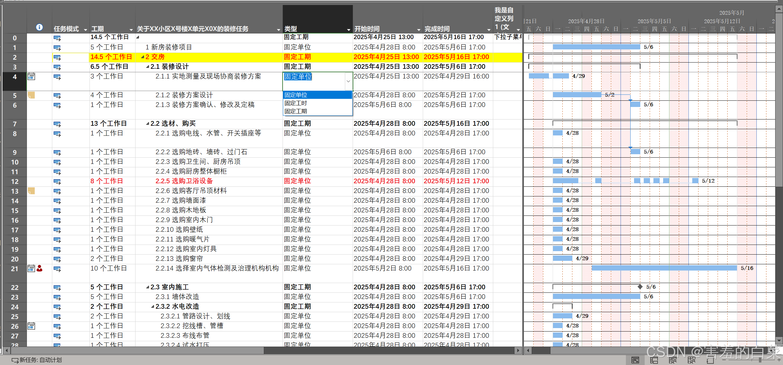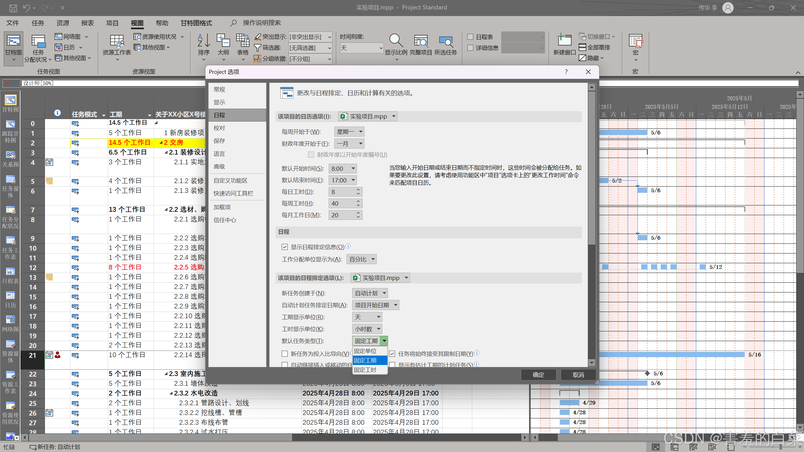 所以默认的固定单位的任务类型并不代表正确的工期(例如1个人10天干完活,2个人一定能5天干完吗?这个是不确定的而且这种情况在现实生活中基本上不存在)现实生活中资源数量和工期基本上不会呈严格的反比例关系