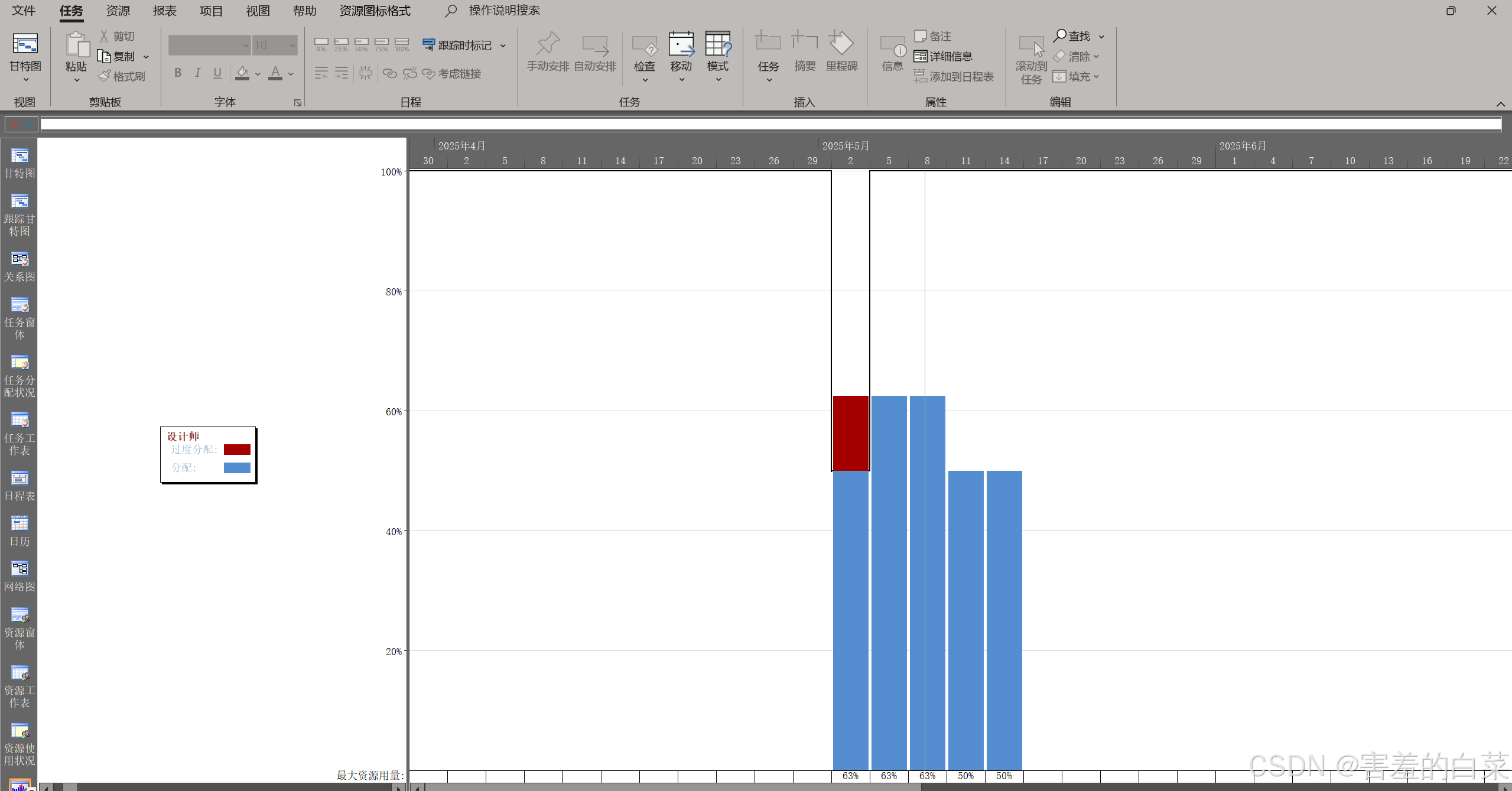 这时我们回到资源图表中就能看到设计师在5.2这天加班了,也就是资源过度分配了
