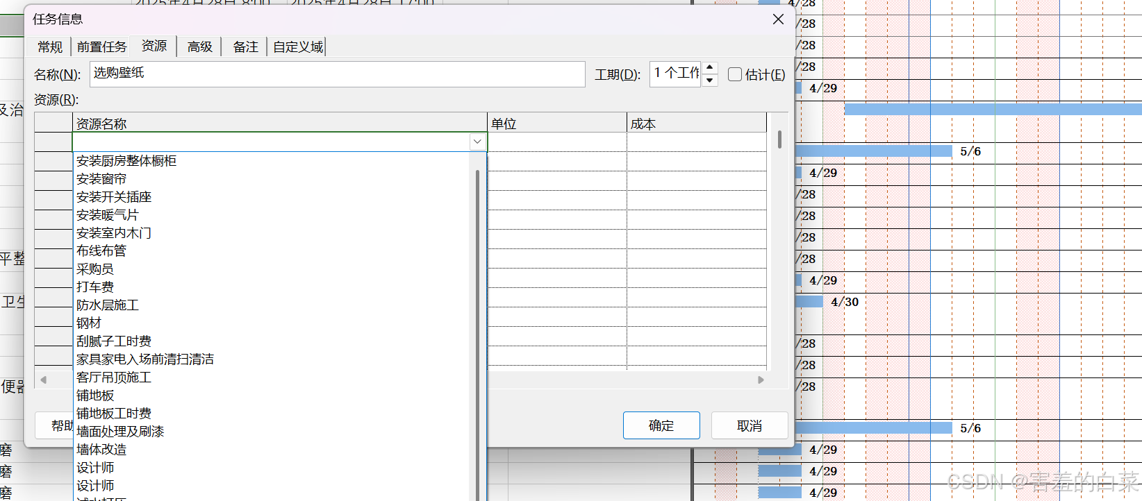 资源名称列可以对资源完成“多选”,比如一个任务需要同时或者不同时用到资源1、资源2、资源3…….