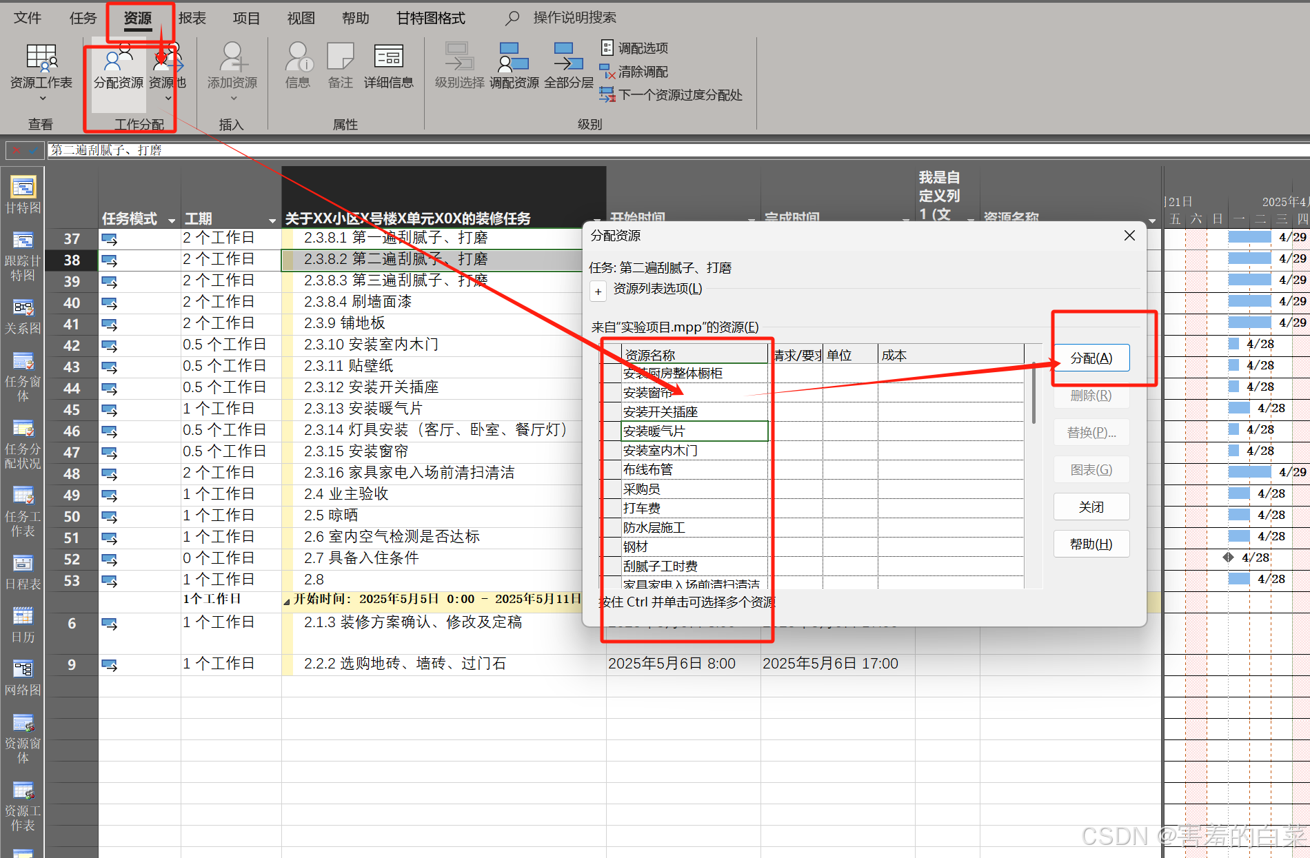 直接在最上方的“资源选项卡”中单击“分配资源”然后点击“分配”即可