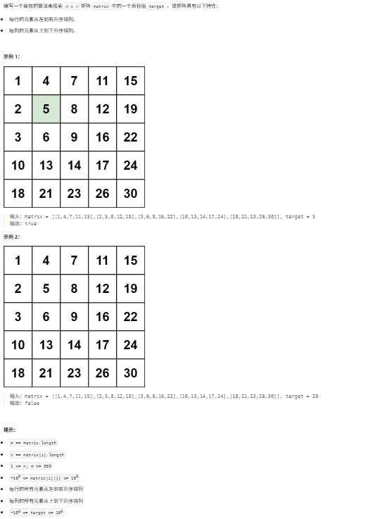 方法2:学习Krahets佬的思路,从搜索矩阵的左下角开始遍历,matrix[i][j] > target时消去第i行,matrix[i][j] < target时消去第j列。