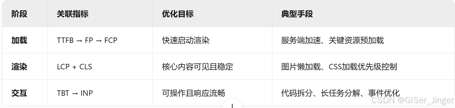 | 阶段 | 指标 | 全称 | 关注点 | 优化重点 |
