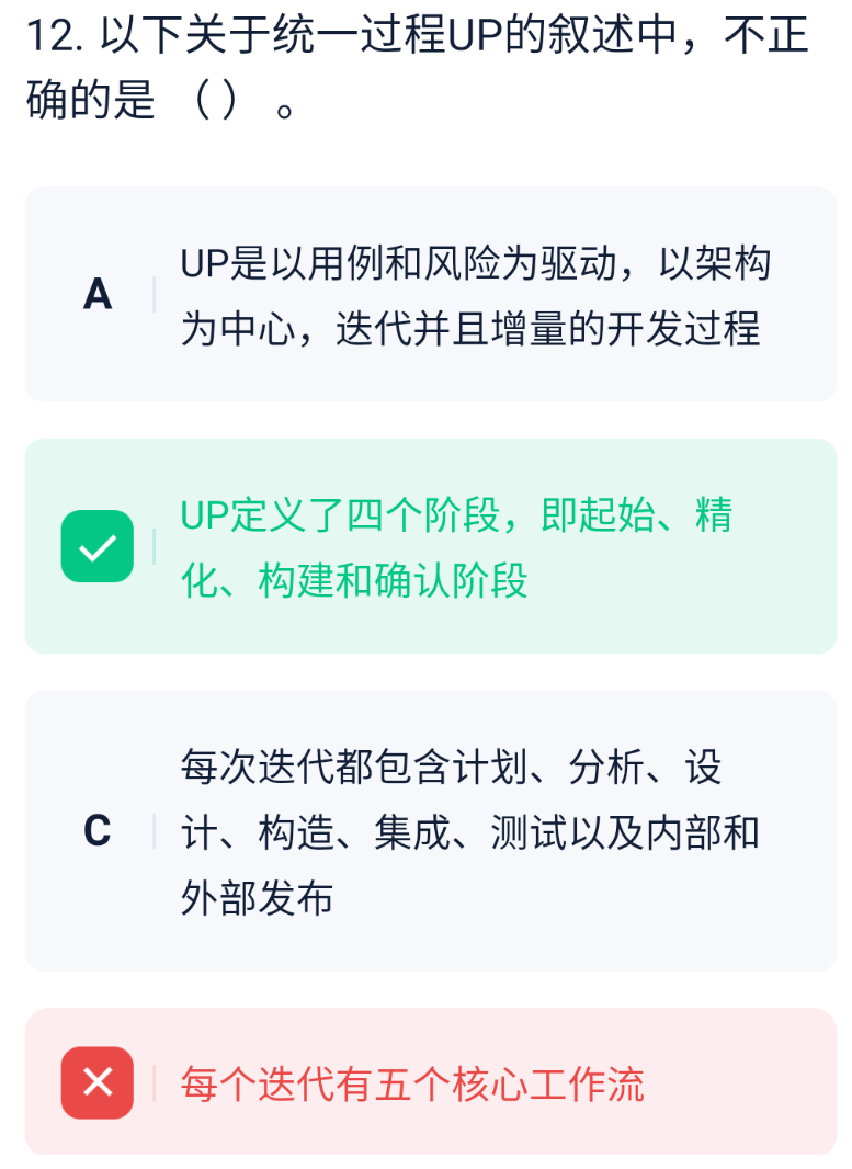 B:UP定义的四个阶段是起始、精化、构建和交付阶段,并非确认阶段。起始极端确定项目的目标和范围;精化阶段进一步明确需求、细化架构;构建阶段进行系统的开发和实现;交付阶段将产品交付给用户