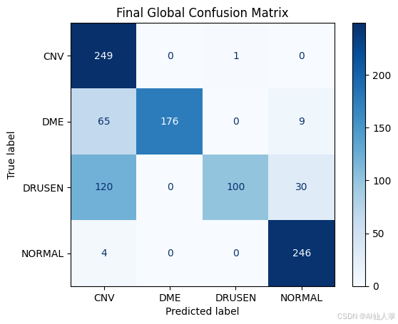 数据集本身也存在类别不平衡问题,正常 OCT 图像的样本最多,而玻璃膜疣(Drusen)的样本最少,这可能解释了在最终全局混淆矩阵中对这一标签的误分类。