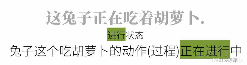 | 现在完成进行时态 | 现在某物完成了某物但接下来还要做 | 一只兔子现在吃了半斤胡萝卜,它还要继续吃 |