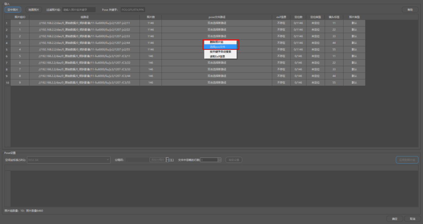 手动选择单个pose文件;或选择多个照片组,点击鼠标右键,在下拉菜单中选择选择pos文件,需要注意的是,此种定位方式为多个照片组对应一个pose文件。