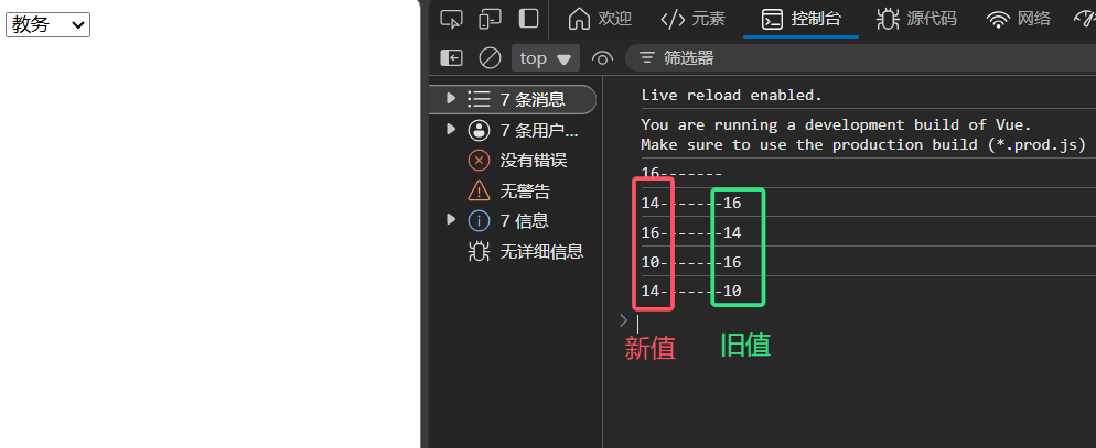 <div id="app"> <select v-model="a.msg"> <option value="10">学生</option> <option value="12">老师</option> <option value="14">教务</option> <option value="16">管理员</option> </select> {{a}} </div> <script type="module"> import { createApp, ref, reactive, watch } from '/vue.esm-browser.js' createApp({ setup() { const a = ref({ msg: "", obj: "" }) watch(() => a.value.msg, (a, b) => { console.log(a + "-------" + b); }) return { a, } } }).mount("#app") </script>注意:参数绑定的是a.msg,监听的观察要写成() => a.value.msg