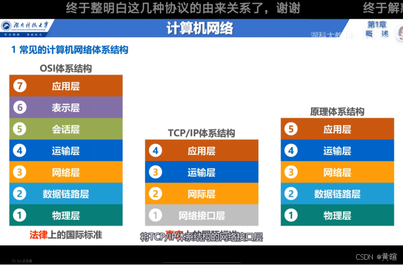| 五层协议原理体系结构 | 5层 | 教学导向,兼顾细节 | 计算机网络原理课程学习 |